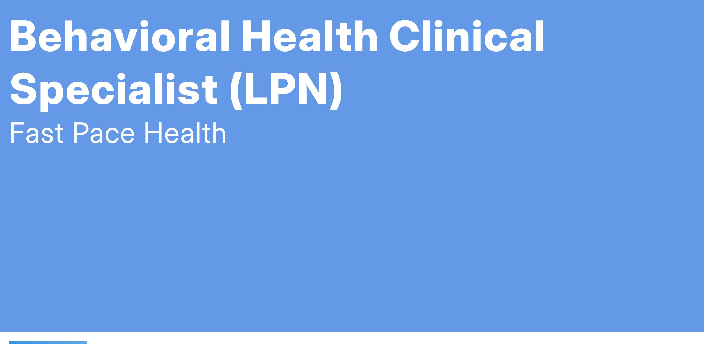 Fast Pace Health strives to provide a best in class patient experience in every interaction. We are seeking a highly-skilled, experienced Behavioral Health Clinical Specialist (LPN or RN) to join our growing team. Our ideal candidate will be deeply committed to nurturing our Fast Pace mission of teamwork, communication, empowerment and quality care in a friendly and encouraging environment.