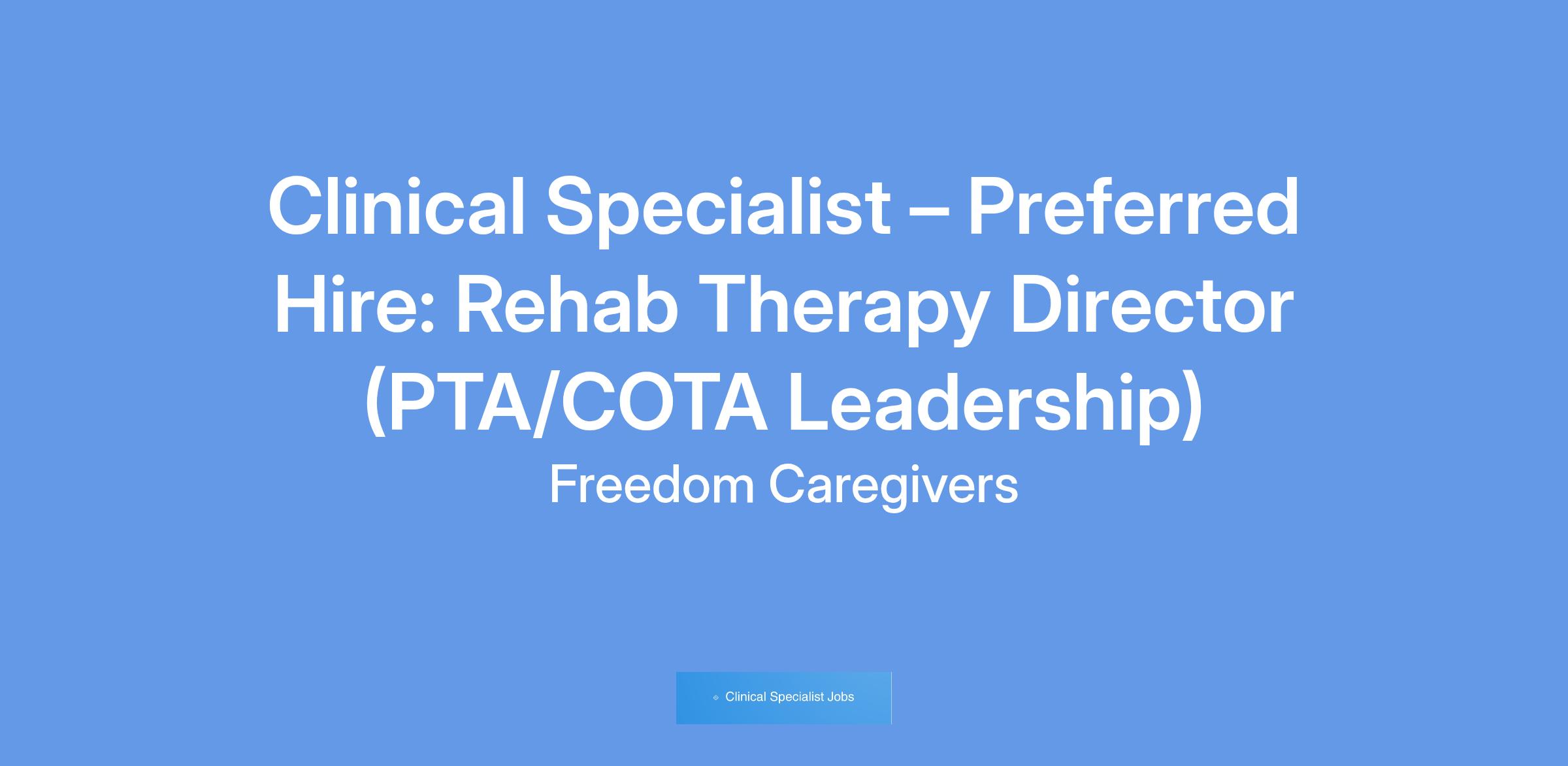 We are seeking a Clinical Specialist / Rehab Therapy Director with a background as a PTA or COTA who’s ready to take the next step in their career. This role combines clinical expertise with leadership responsibilities, overseeing therapy services and ensuring the highest standards of client care and staff performance.