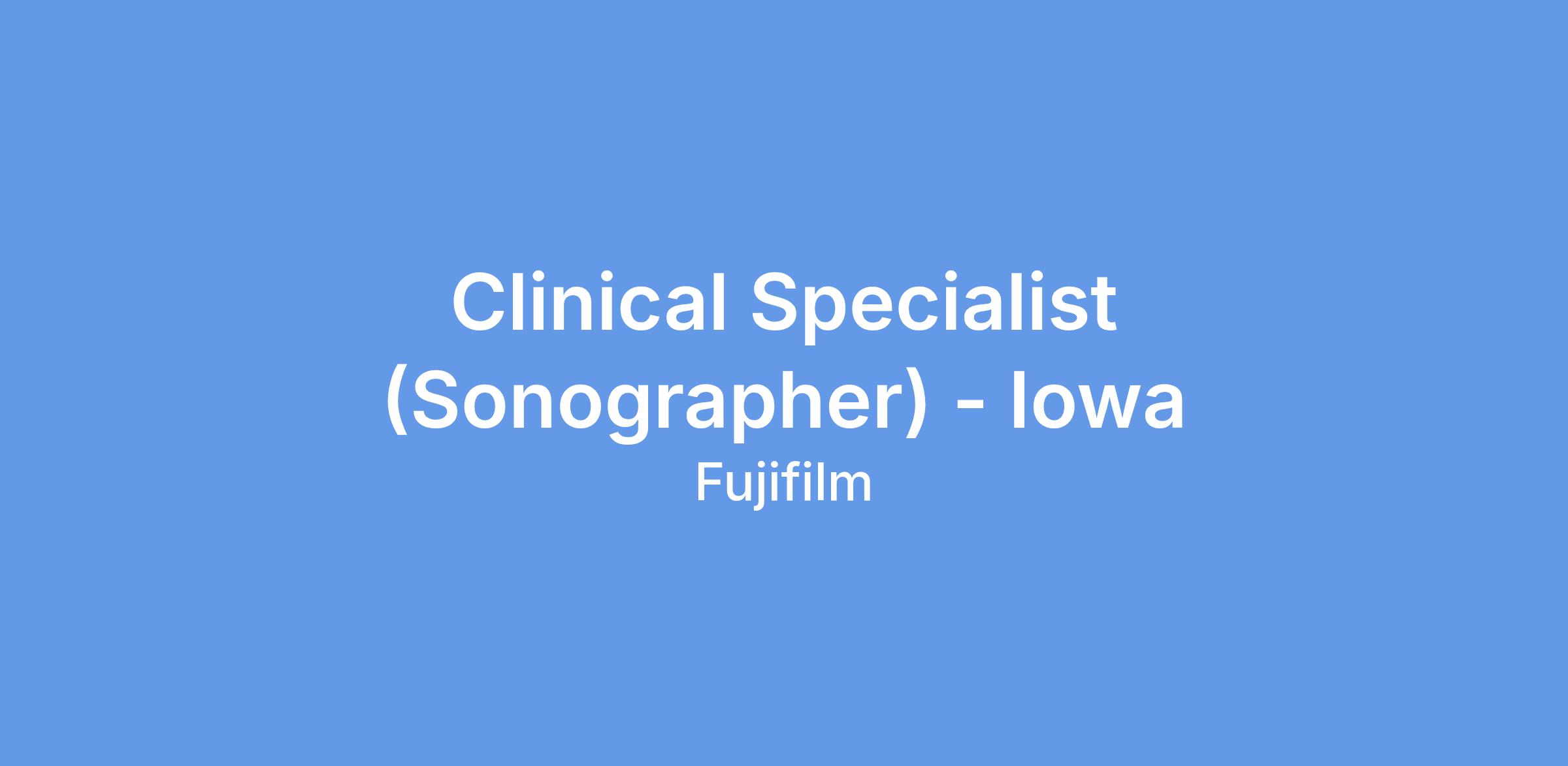The Clinical Specialist (RDCS Certification Preferred) - Iowa position is responsible for understanding and addressing the clinical needs of customers within an assigned territory. The Clinical Specialists partner with Territory Managers to demo FUJIFILM Sonosite products, close deals, and ensure ongoing positive customer experience. After the sale, this role owns client relationships and works to encourage customer adoption and use of FUJIFILM Sonosite products.