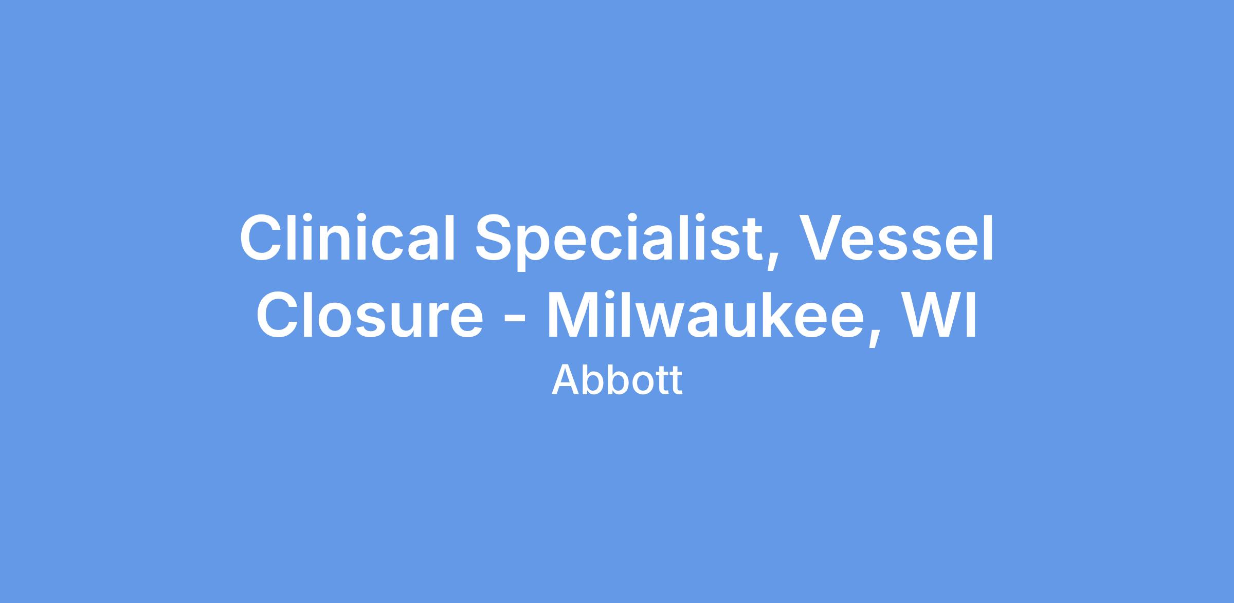 We currently have an opportunity for a Clinical Specialist, Vessel Closure, in Milwaukee, WI. The Clinical Specialist will primarily be responsible for case planning, case support coverage, and product pull- through throughout the designated territory, and throughout the Region as needed. The Clinical Specialist will promote Vascular products through education, service and training of customers in the hospital setting. The Clinical Specialist will provide clinical education and sales support in order to assist in achieving projected sales goals, increasing sales revenues within assigned product lines, and increasing market share. This position will have a heavy focus on Vessel Closure.