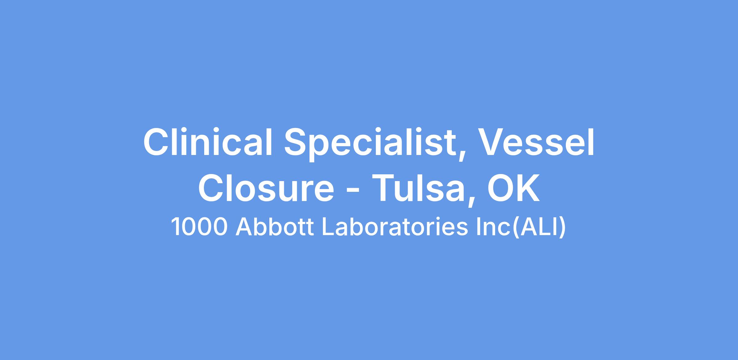We currently have an opportunity for a Clinical Specialist, Vessel Closure, in Tulsa, OK. The Clinical Specialist will primarily be responsible for case planning, case support coverage, and product pull- through throughout the designated territory, and throughout the Region as needed. The Clinical Specialist will promote Vascular products through education, service and training of customers in the hospital setting. The Clinical Specialist will provide clinical education and sales support in order to assist in achieving projected sales goals, increasing sales revenues within assigned product lines, and increasing market share. This position will have a heavy focus on Vessel Closure.