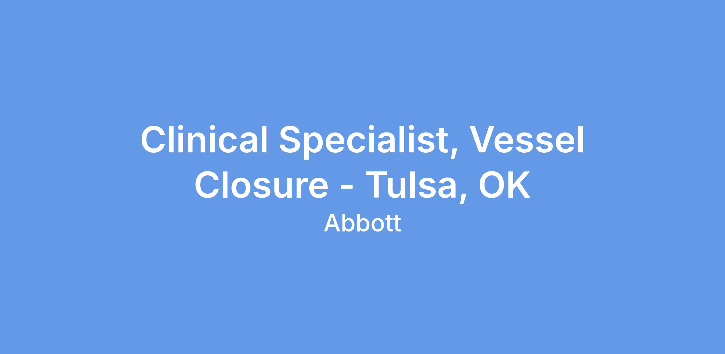 We currently have an opportunity for a Clinical Specialist, Vessel Closure, in Tulsa, OK. The Clinical Specialist will primarily be responsible for case planning, case support coverage, and product pull- through throughout the designated territory, and throughout the Region as needed. The Clinical Specialist will promote Vascular products through education, service and training of customers in the hospital setting. The Clinical Specialist will provide clinical education and sales support in order to assist in achieving projected sales goals, increasing sales revenues within assigned product lines, and increasing market share. This position will have a heavy focus on Vessel Closure.
