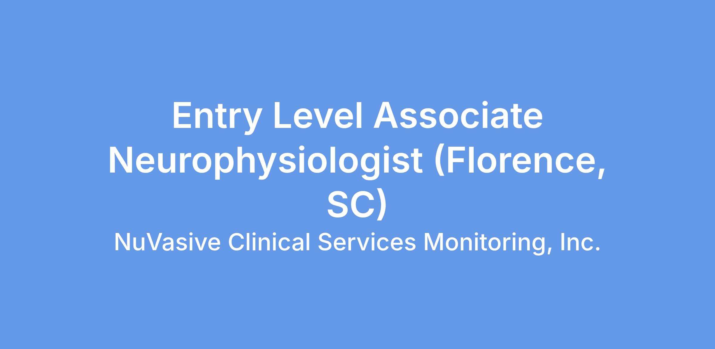 As a Neuromonitoring Specialist at NuVasive Clinical Services, provide intraoperative neuromonitoring during surgery by monitoring the patientβs nervous system. A high standard of patient care is essential to our team. This is an opportunity for you to work with top surgeons and other medical professionals in a team environment and play a vital role in the operating room every day. As a member of our team, you will also support NuVasive technological innovations. NuVasive provides comprehensive training, continuing education, and numerous opportunities for career development. Please note this is a field-based role.