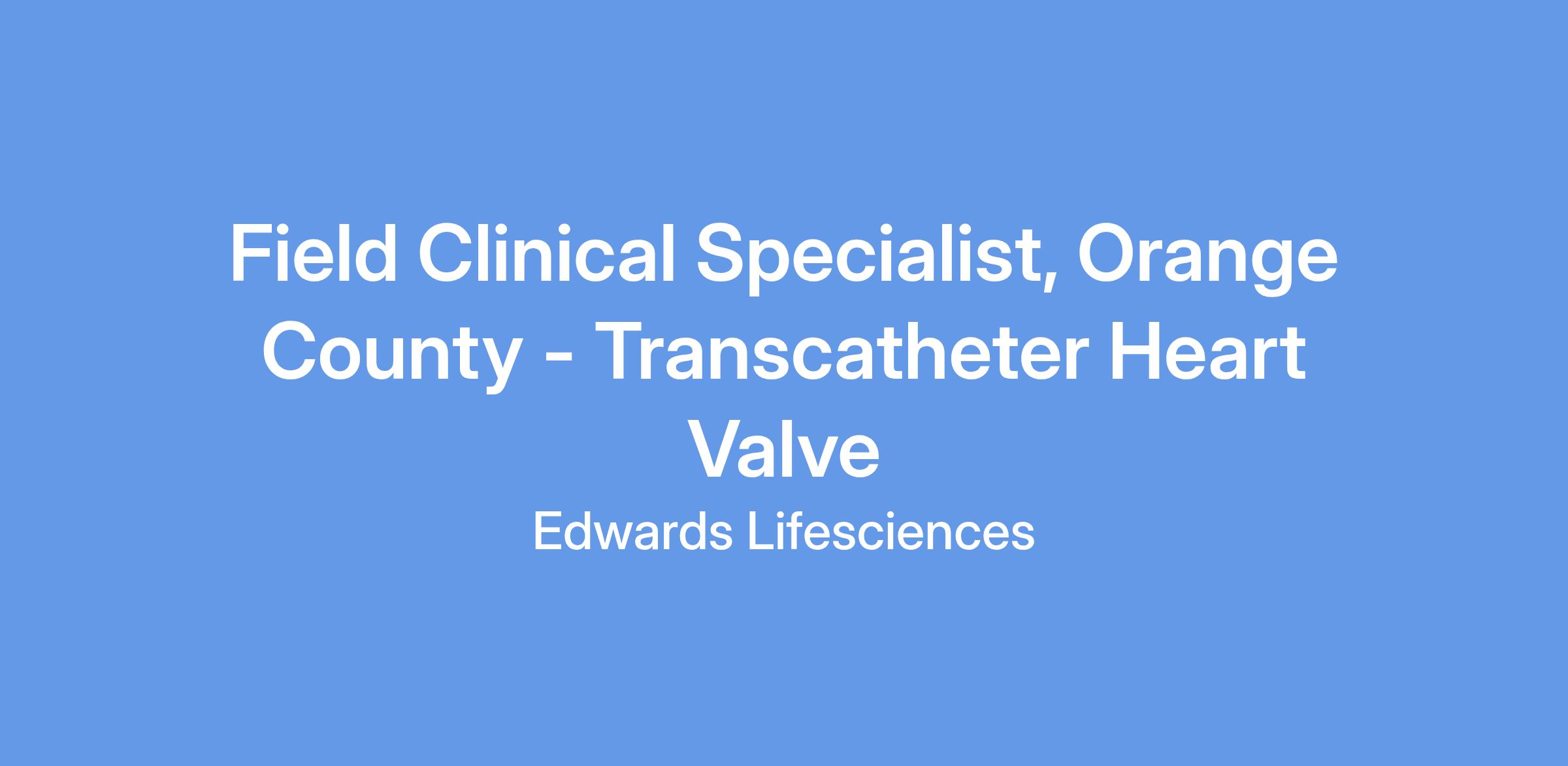 Make a meaningful difference to patients around the world. As a part of the Field Clinical Specialist team, you will be a critical part of delivering our patient focused innovations, partnering with clinical professionals, and training them on using our groundbreaking products. Your knowledge of working within the hospital ecosystem, combined with our in-depth training program, will help develop you into an Edwards subject matter expert, so you can play your own part in transforming patient lives.