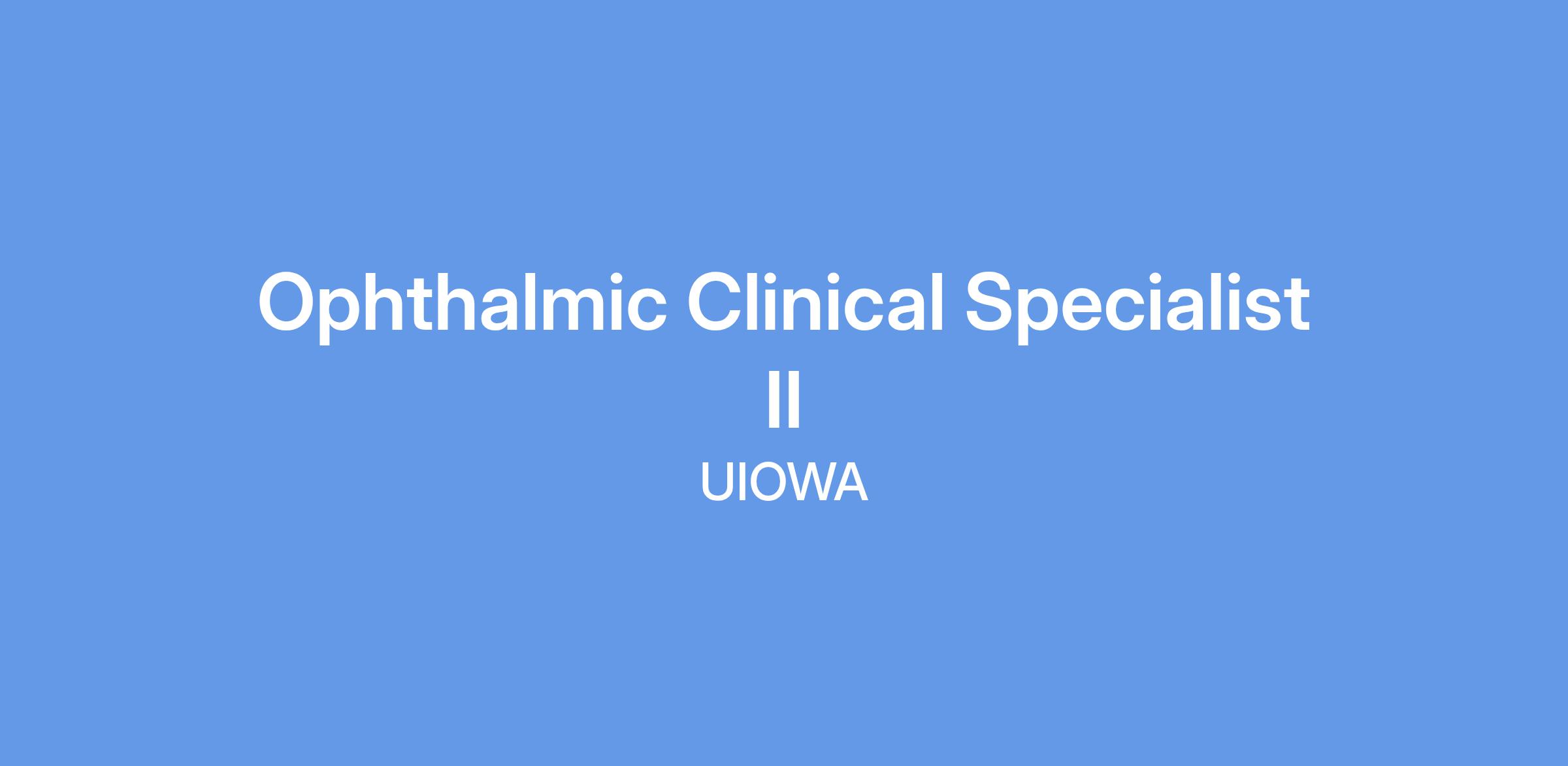 The University of Iowa Health Care Department of Ophthalmology & Visual Sciences is seeking an 100% Ophthalmic Clinical Specialist II (GC83) responsible for performing highly technical optical testing as a major portion of the complete eye exam, prior to the dilated fundus exam (DFE), in addition to obtaining patient histories, medications, and allergies, and visual acuity for the supervising physician.
