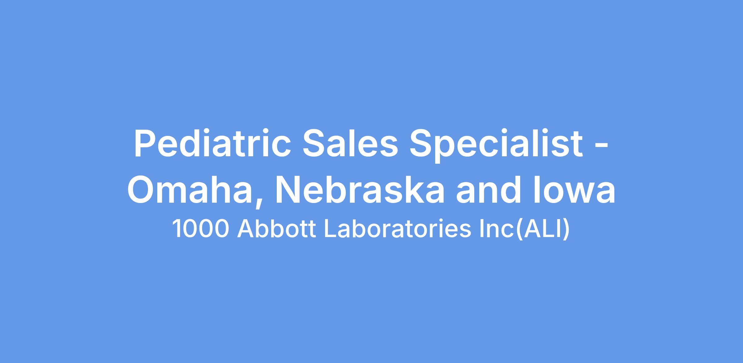 Our location in Omaha, Nebraska and Western Iowa currently has an opportunity for a Pediatric Sales Specialist. This position is responsible for the promotion, management and growth of Abbott Pediatric Nutritional products in