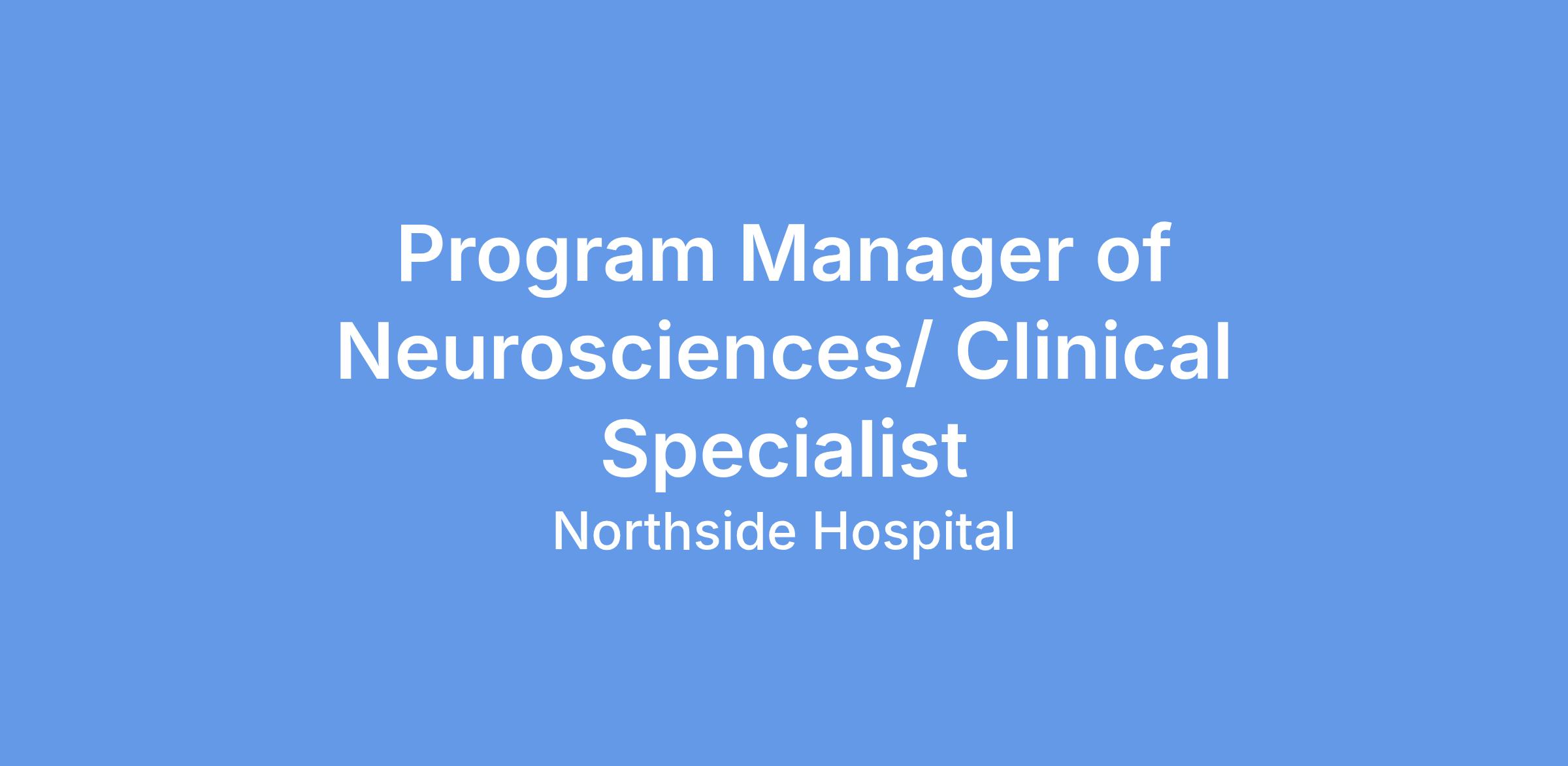 The Neurosciences Program Manager is responsible for providing organization, leadership, planning, program development, and growth of the Neurosciences Program. This position is responsible for the clinical program including outcome measurement and monitoring for the neuroscience population. The manager functions in a leadership and clinical expert role to maintain the established standards of care for the neuroscience patient. The manager works with team members to identify and coordinate clinical and educational activities for the Patient Care Departments, the community, and other ancillary departments as needed in the organization. As a Clinical Specialist, provides consultations and serves as a clinical and educational resource for the Northside Hospital system. Responsibilities include collaborating with service line leaders to promote hospital initiatives and comprehensive services including programming, community outreach, and other daily operations of the program. Works collaboratively with private practice and hospital-based neuroscience surgeons, neurologists, internal medicine physicians, general surgeons, and directors and managers of inpatient and outpatient departments. Leads and monitors the activities and outcomes of the Neuroscience Clinical Practice Guideline Teams.
