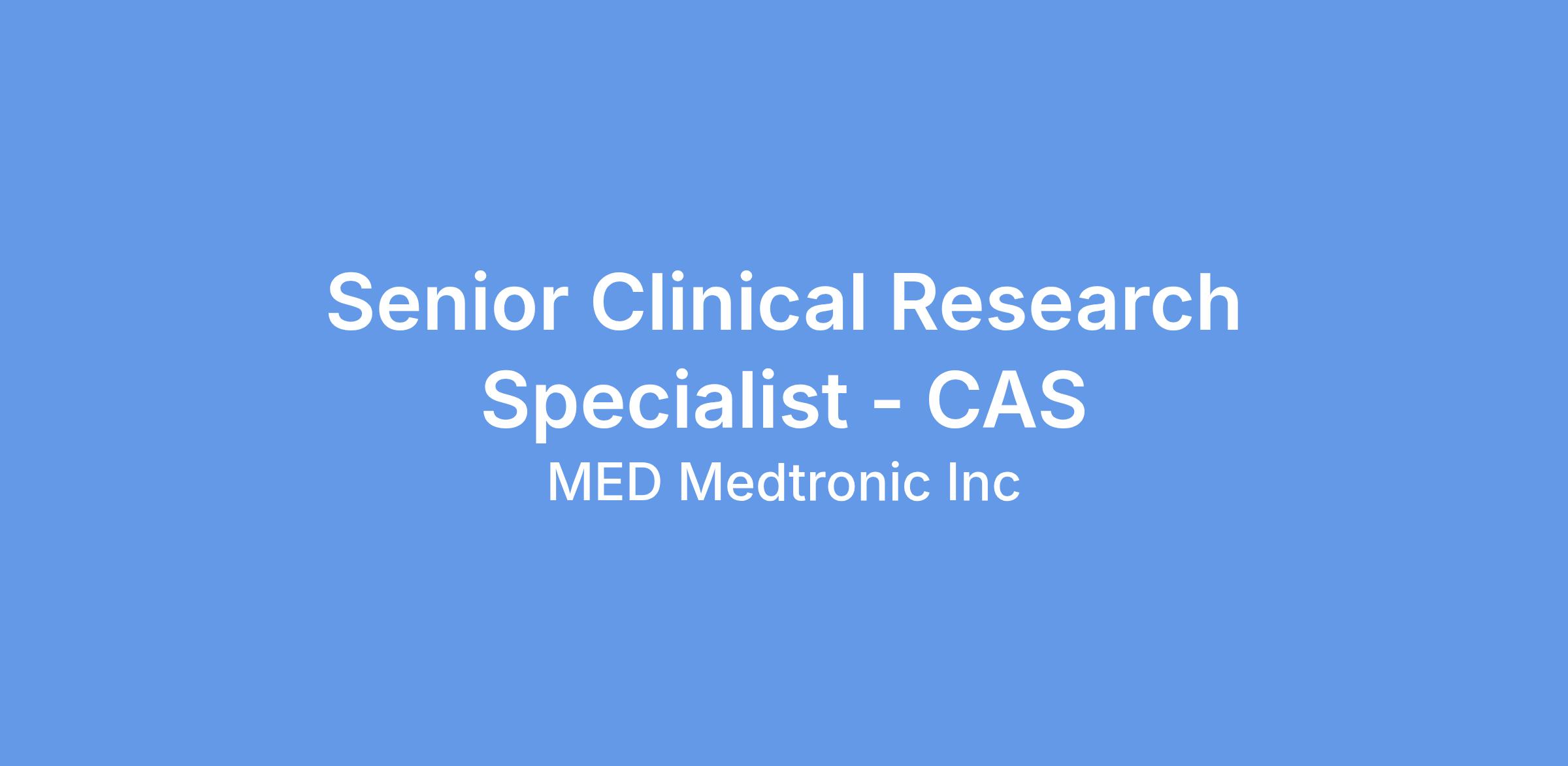 The Senior Clinical Research Specialist will collaborate with other members of the CAS leadership team, as well as other cross-functional stakeholders (e.g., Research and Development, Corporate Biostats, Regulatory Affairs, Clinical IT, and others). In this role, you will collaborates, build relationships, and communicates effectively with a large group of internal and external stakeholders in a rapidly changing landscape, while managing the timely completion of deliverables. This role has a high-level of visibility to senior leaders at Medtronic including Executive Committee members and senior clinical leaders across all OUs.
