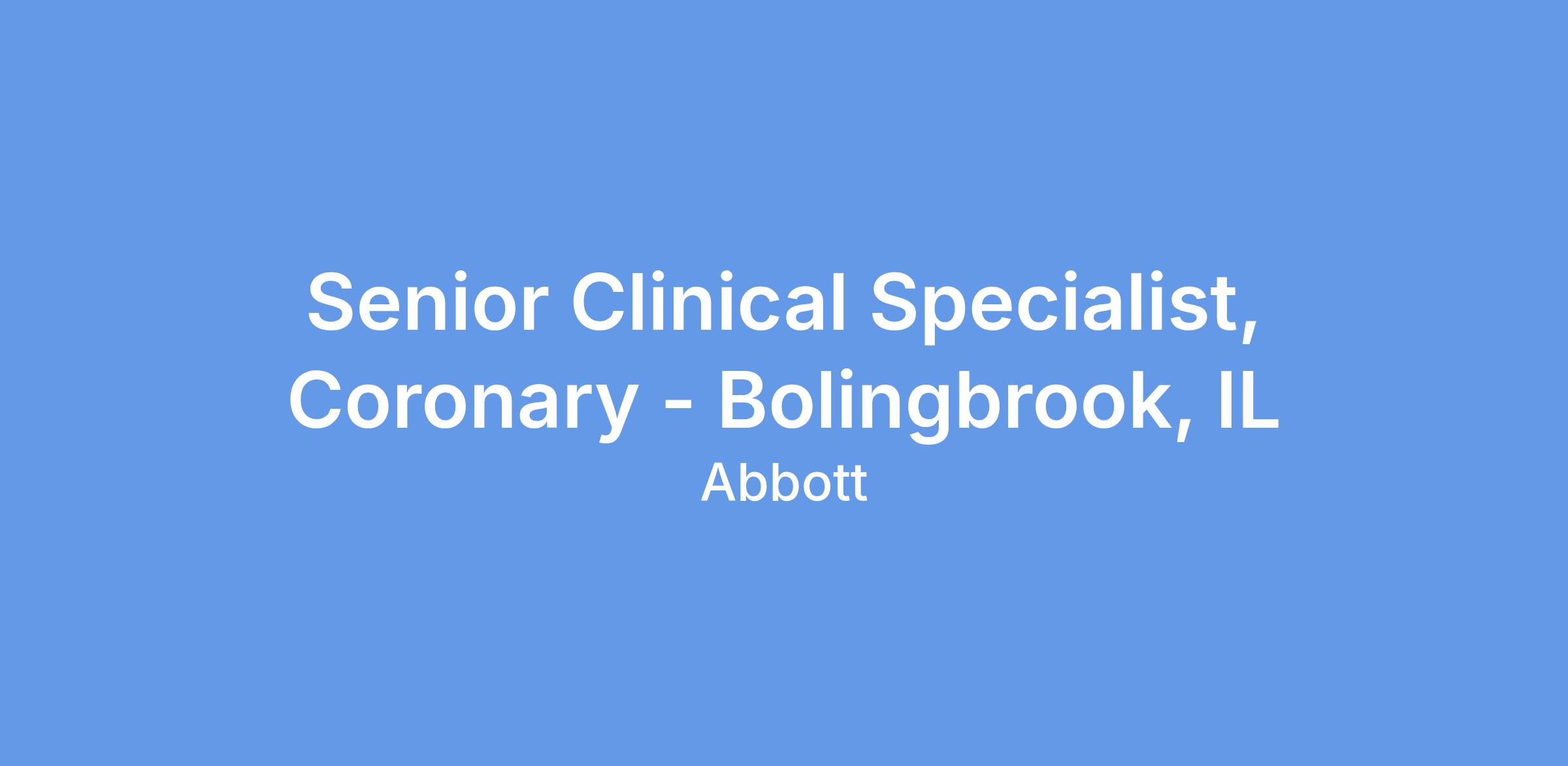We currently have an opportunity for a Senior Clinical Specialist, Coronary, in Bolingbrook, IL. The Senior Clinical Specialist will primarily be responsible for case planning, case support coverage, and product pull- through throughout the designated territory, and throughout the Region as needed. The Senior Clinical Specialist will promote Vascular products through education, service and training of customers in the hospital setting. The Senior Clinical Specialist will provide clinical education and sales support in order to assist in achieving projected sales goals, increasing sales revenues within assigned product lines, and increasing market share. This position will have a heavy focus on Vessel Closure.