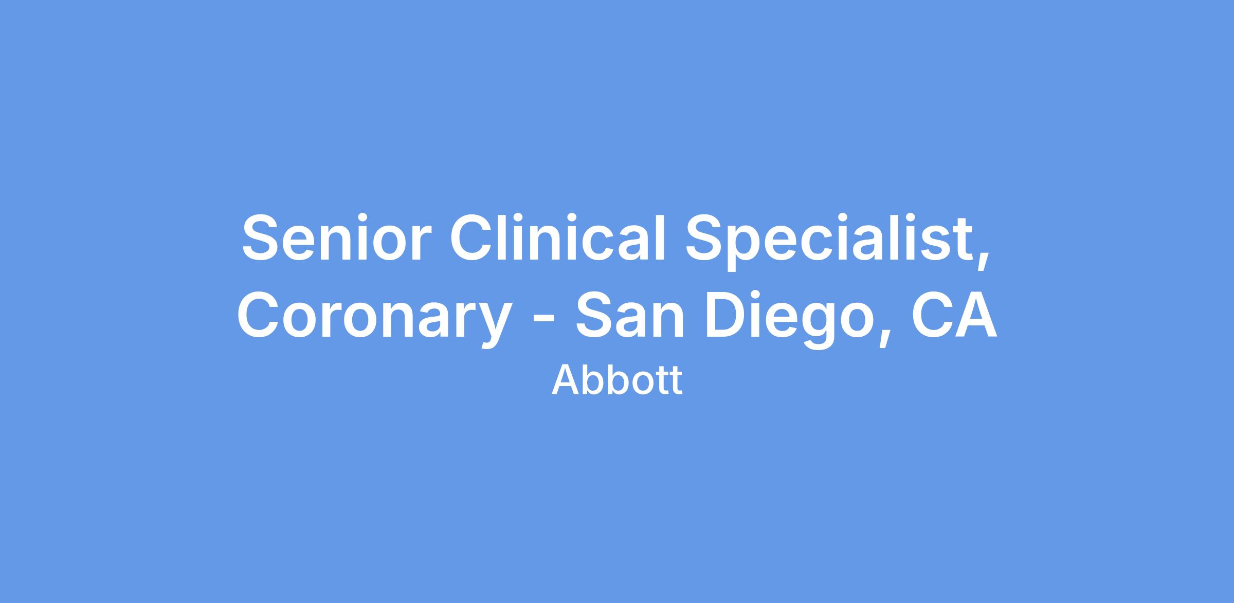 We currently have an opportunity for a Senior Clinical Specialist, Coronary, in San Deigo, CA. The Clinical Specialist will primarily be responsible for case planning, case support coverage, and product pull- through throughout the designated territory, and throughout the Region as needed. The Clinical Specialist will promote Vascular products through education, service and training of customers in the hospital setting. The Clinical Specialist will provide clinical education and sales support in order to assist in achieving projected sales goals, increasing sales revenues within assigned product lines, and increasing market share. This position will report to the Regional Sales Director.