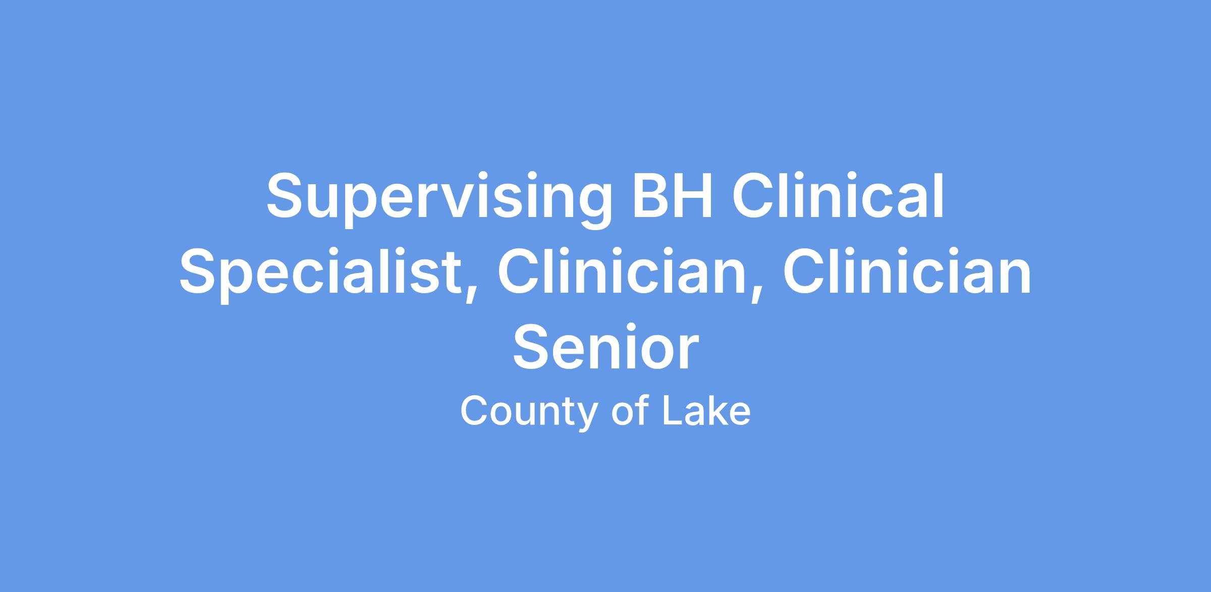 This class is distinguished from Supervising Behavioral Health Clinician in that incumbents in the former have successfully completed all requirements for licensure and are currently licensed in California as a Licensed Clinical Social Worker, Marriage, Family and Child Counselor or Clinical Psychologist.